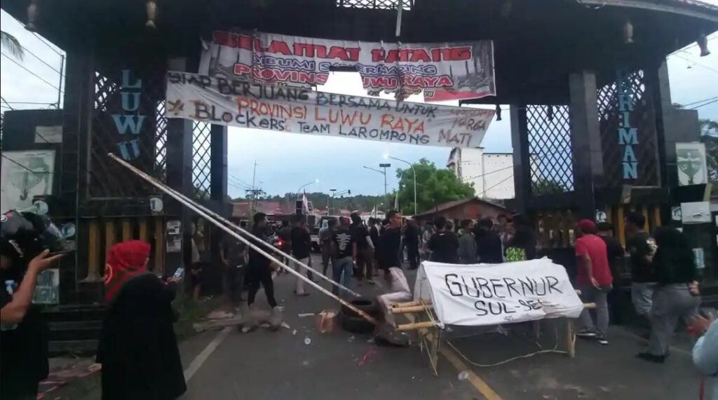 “Kami mengecam Gubernur Sulsel yang telah mengkhianati aspirasi Wija To Luwu untuk memekarkan daerahnya menjadi Provinsi Luwu Raya,” teriak salah satu orator.