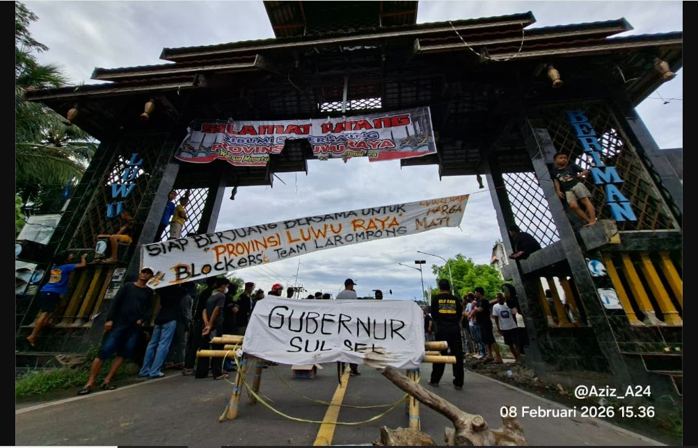 Genews.co.id Ratusan massa dari gabungan mahasiswa, pemuda, dan warga Kabupaten Luwu menggelar aksi unjuk rasa dengan memblokade pintu gerbang perbatasan Kabupaten Luwu dan Kabupaten Wajo, tepatnya di Batulappa, Kecamatan Larompong Selatan, Minggu sore (8/2/2026).