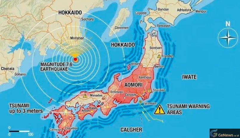 GeNews.co.id – Gempa bumi berkekuatan 7,5 magnitudo mengguncang wilayah timur laut Jepang pada Senin malam, 8 Desember 2025. Guncangan kuat itu membuat sekitar 90.000 warga harus dievakuasi dan mendorong Badan Meteorologi Jepang (JMA) mengeluarkan peringatan tsunami.