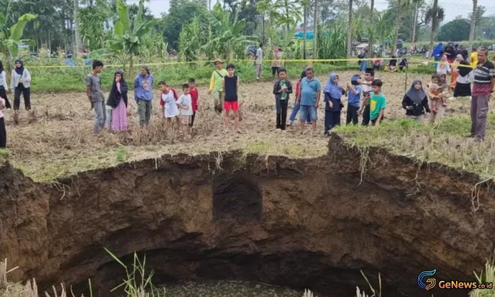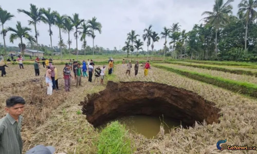 Genews.co.id -Warga Jorong Tepi, Nagari Situjuah Batua, Kabupaten Limapuluh Kota, Sumatera Barat, mendadak gempar setelah munculnya sebuah lubang berukuran besar di tengah area persawahan. Lubang tersebut berada di kawasan pertanian Pombatan, tepatnya di lahan sawah milik seorang warga setempat.