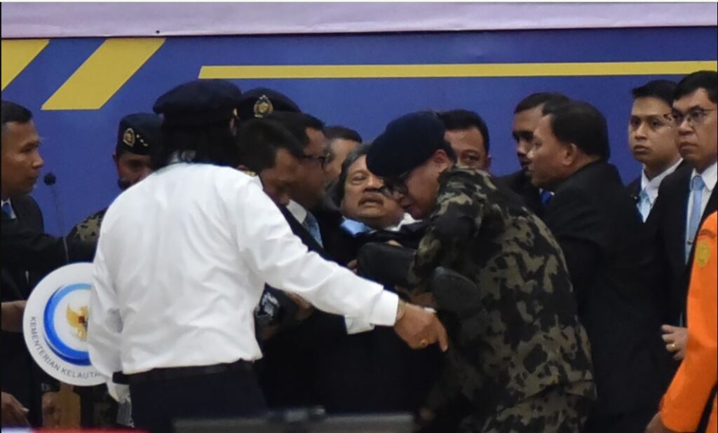 Insiden terjadi di Auditorium Madidihang, Akademi Usaha Perikanan (AUP) Kelautan dan Perikanan, Pasar Minggu, Jakarta Selatan. Upacara tersebut digelar untuk menyampaikan penghormatan terakhir kepada tiga pegawai KKP yang tewas dalam kecelakaan pesawat ATR 42-500.