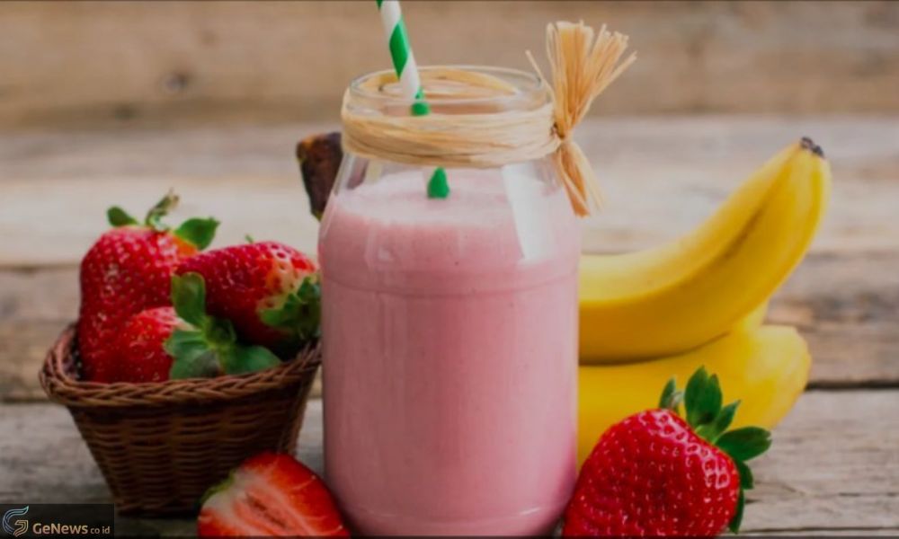Potong pisang, blender bersama stroberi dan susu hingga halus. Sajikan dengan es batu