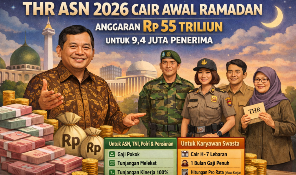 Pemerintah memastikan Tunjangan Hari Raya atau THR 2026 tetap cair bagi aparatur negara. Anggaran sebesar Rp 55 triliun telah disiapkan untuk ASN, prajurit TNI, anggota Polri, serta penerima pensiun. Kebijakan ini disampaikan dalam keterangan resmi pemerintah menjelang Ramadhan 2026.