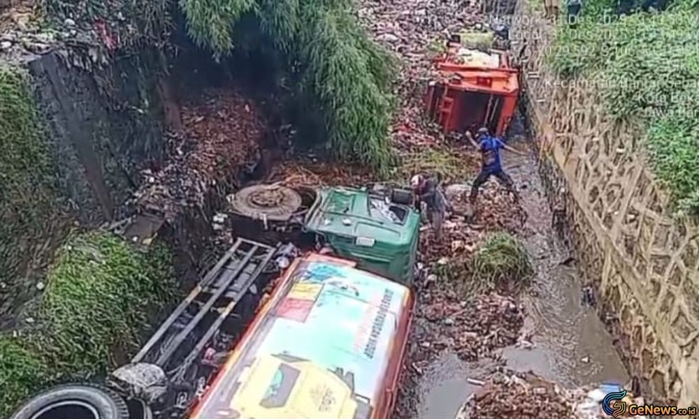 GeNews.co.id -Timbunan sampah di kawasan Tempat Pengolahan Sampah Terpadu (TPST) Bantargebang, Kota Bekasi, mengalami longsor pada Rabu (31/12/2025). Insiden terjadi ketika tiga unit truk yang sedang melintas tertimpa material sampah, lalu kehilangan kendali dan tergelincir hingga terperosok ke aliran kali di wilayah Sumur Batu.